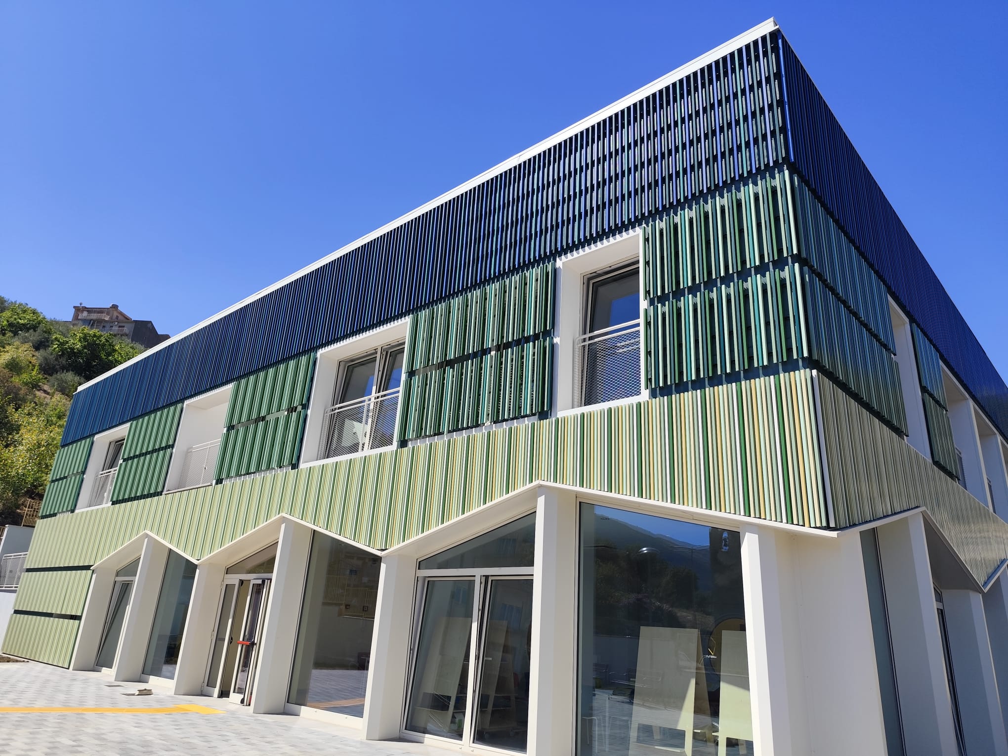 L’architettura nasce dal territorio e ne rielabora i caratteri in chiave contemporanea: i colori delle maioliche del campanile, i materiali locali come ceramica e legno, i paesaggi montani e le visioni dei bambini diventano elementi compositivi. L’intero edificio, certificato LEED (il primo in Sicilia), è un dispositivo educativo sostenibile, inclusivo e accessibile a tutti.