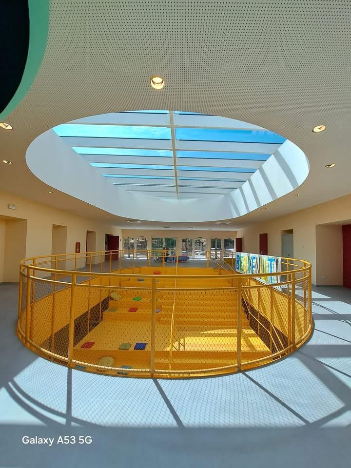 La nuova scuola si sviluppa su due livelli e accoglie la scuola dell’infanzia, primaria e secondaria di primo grado in spazi funzionalmente indipendenti ma interconnessi. Gli ambienti interni sono flessibili e riconfigurabili, pensati per una didattica attiva e non frontale. L’agorà centrale, illuminata zenitalmente da un ampio lucernario, è il cuore pulsante dell’edificio: uno spazio multifunzionale destinato a usi scolastici e comunitari, capace di ospitare eventi, spettacoli, incontri pubblici.